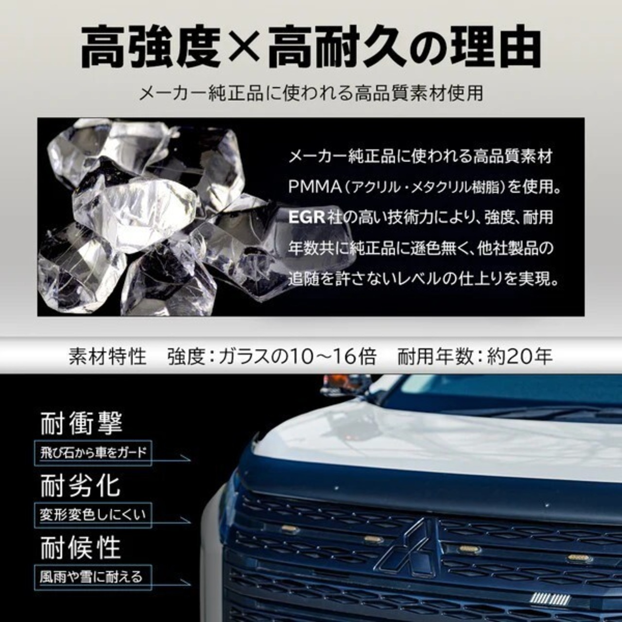 大手自動車メーカー「トヨタ(トヨタ)」「三菱(ミツビシ)」「ホンダ(ホンダ)」も採用している耐衝撃性に優れた、高強度のアクリルを使用。