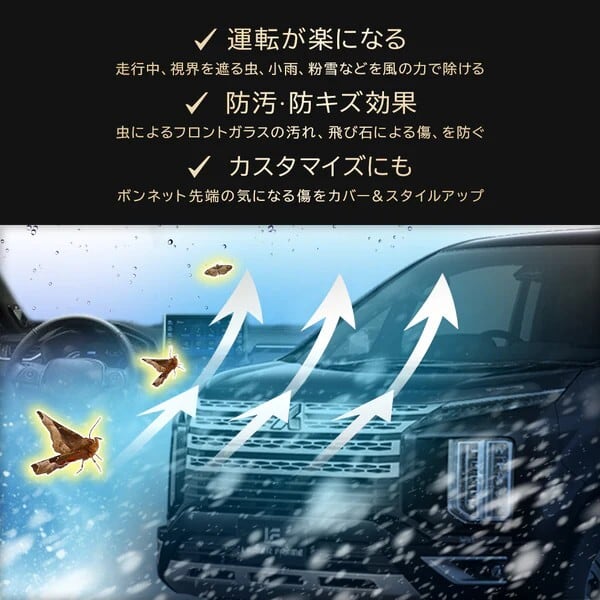 高速走行中のフロントガラスに「虫」を付けず、長時間走行した時の汚れのほうが違う! 整流効果がある為、小雨や粉雪にも効果アリ。 飛び石によるボンネット先端の傷隠しにも。